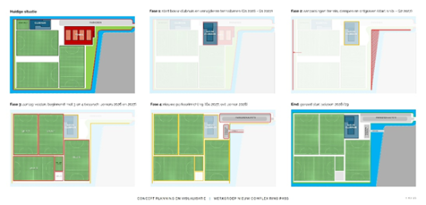 We voorzien nu dat het traject van 2026 tot en met 2027 zal duren, opgedeeld in verschillende fases. Deze hebben we weergegeven in de afbeelding. Fase 1 is de start van de bouw van het nieuwe clubhuis op de plek waar nu nog tennisvelden 1 en 2 liggen. Deze bouw zal heel 2026 duren tot aan het eerste kwartaal van 2027. Fase 2 bestaat uit aanpassingen aan het terrein. Fase 3 bestaat uit de stapsgewijze nieuwe aanleg van de velden. Het doel is deze eind 2027 gerealiseerd te hebben. Fase 4 tenslotte is de inrichting van de parkeerterreinen inclusief aanleg van de nieuwe fietsroute. Ook deze fase proberen wij in 2027 af te ronden, maar mogelijk wordt dit de zomer van 2028 omdat er op dat moment weinig activiteiten zijn op de club.