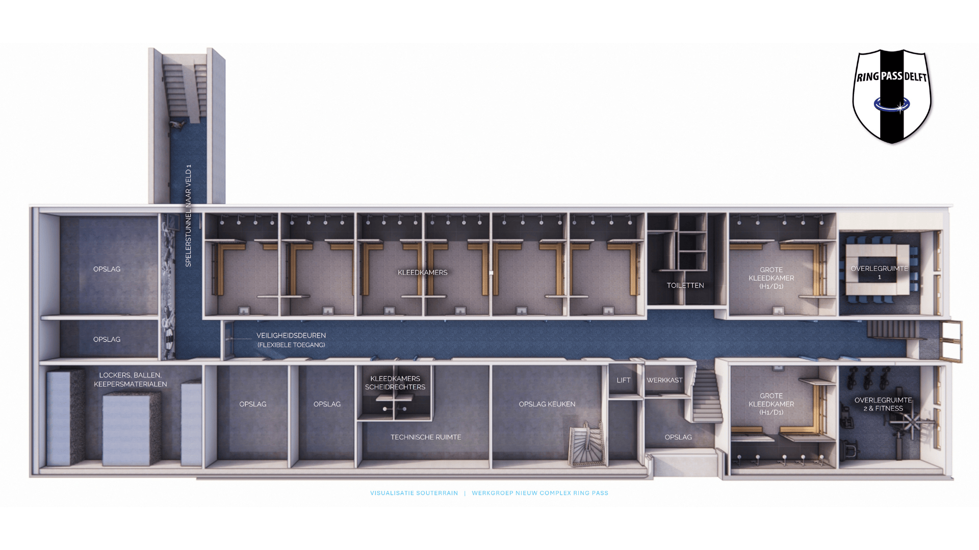 Op de afbeelding zie je geheel links in de hal dubbele deuren. Die zijn voor de brandveiligheid maar dubbelen als flexibele veiligheidsdeuren. Ofwel, als het clubhuis dicht is dan zijn die deuren gesloten, maar heb je nog wél toegang tot het deel links daarvan: de opslag voor de trainingsmaterialen en keepersspullen. Die kunnen dan via de spelerstunnel naar buiten worden gebracht voor gebruik. En de zware spullen? Geen probleem, die kunnen worden gerold want er komen zowel trappen als een hellingbaan.