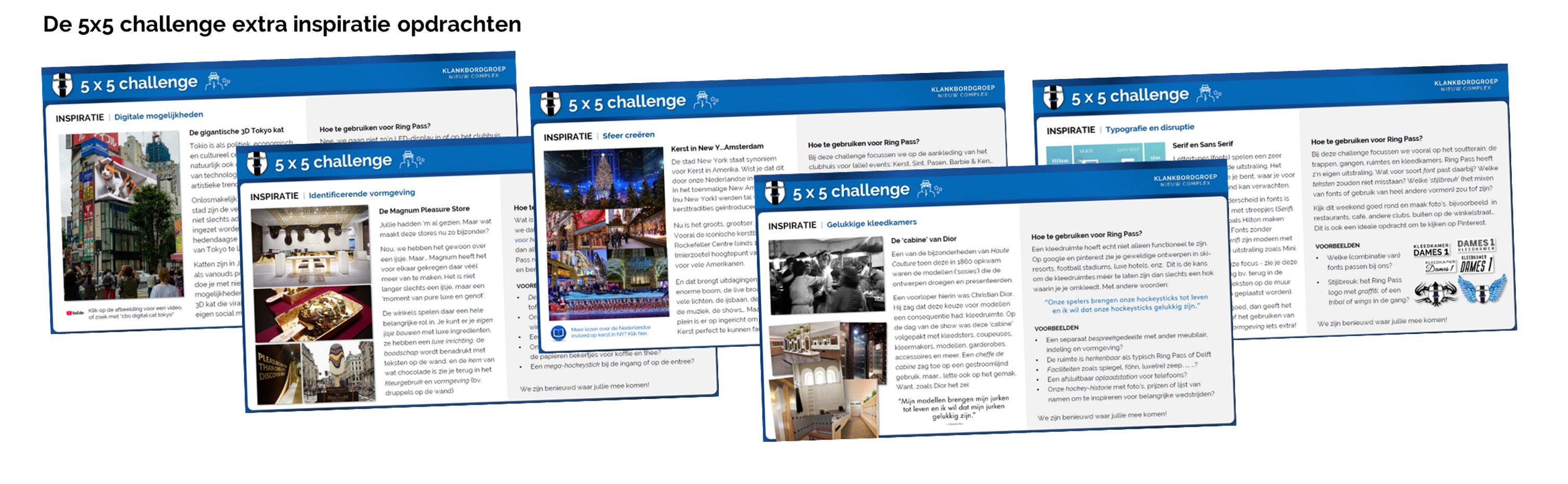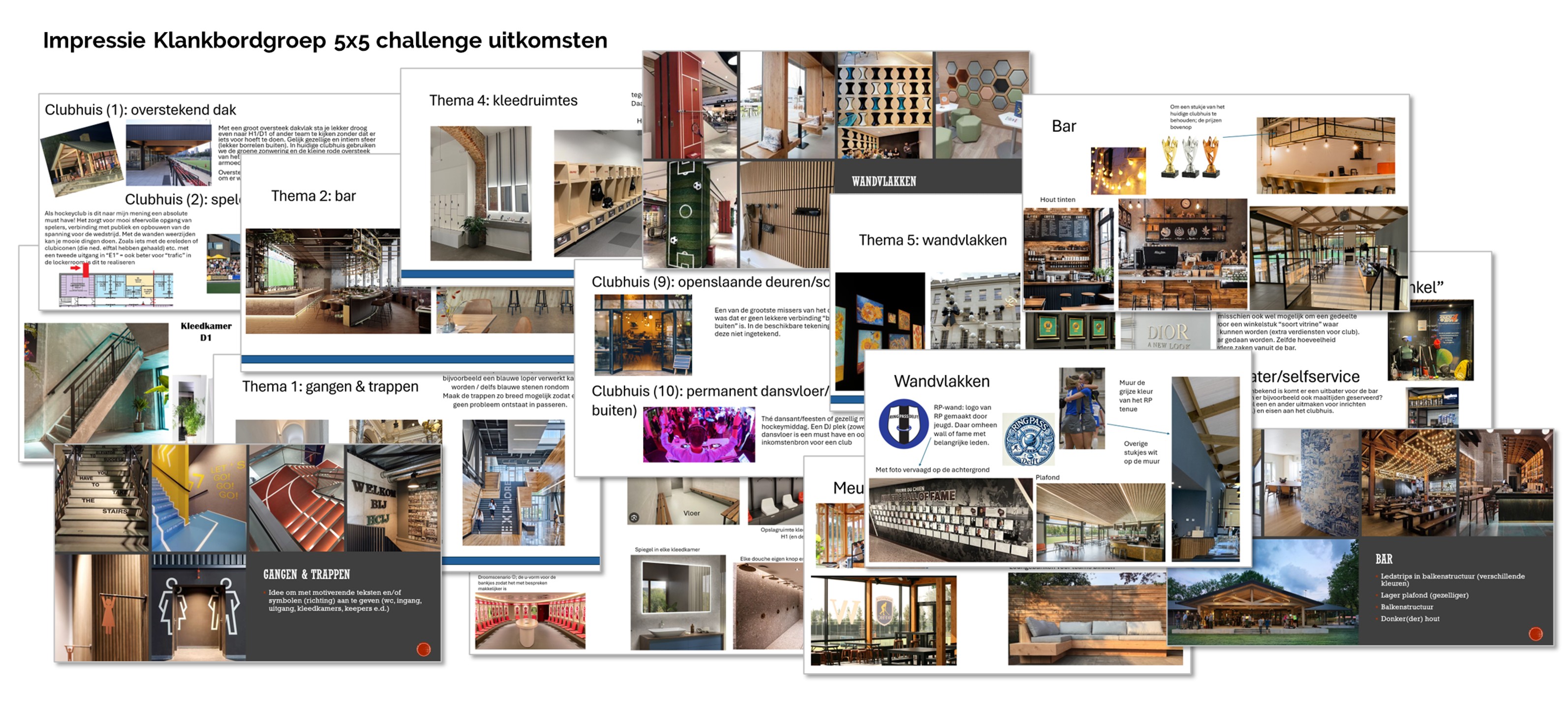 Met deze vijf thema’s en de extra inspiratie ging de Klankbordgroep aan de slag. Vijf weken lang niet alleen op zoek naar ideeën vanuit andere hockeyclubs, maar ook om eens goed rond te kijken elk weekend en foto’s te maken. Bijvoorbeeld in restaurants, een café, de bioscoop, buiten op de winkelstraat. Maar ook om aan medespelers te vragen, rond te kijken in magazines, en te zoeken op bijvoorbeeld Instagram, Pinterest, en zo meer.